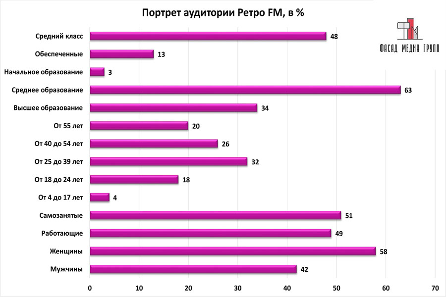 Благодаря качественному, сбалансированному контенту аудитория «Ретро ФМ» многочисленна и разнообразна.