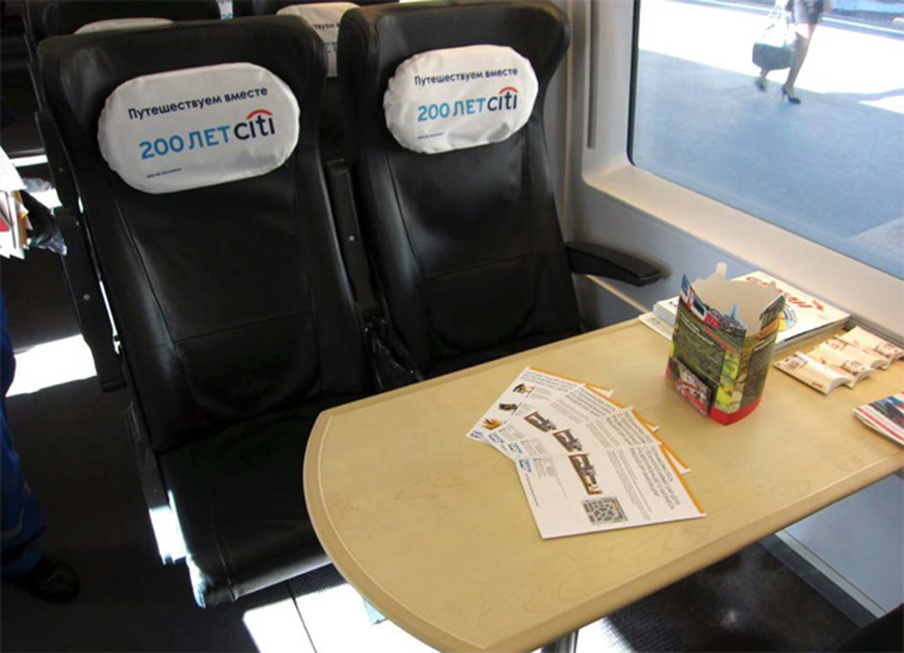 Реклама на подголовниках в поездах на фото выше