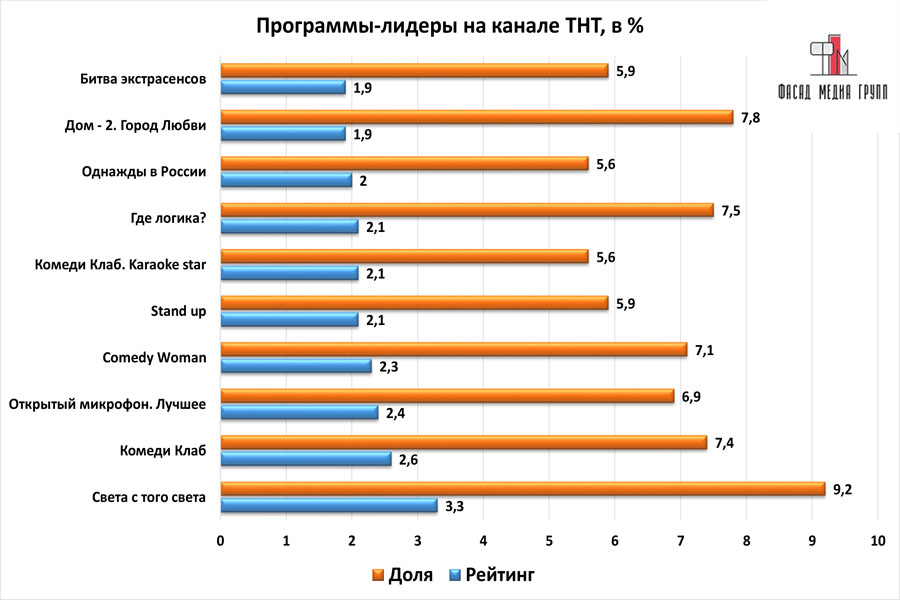 Передачи, шоу, сериалы и фильмы «ТНТ» традиционно собирают огромную аудиторию. Рекламодатели активно раскупают эфирное время «ТНТ» для размещения рекламы. К слову, основной источник дохода «ТНТ» - это средства от продажи рекламы. Графически рейтинги «ТНТ» можно представить следующим образом: