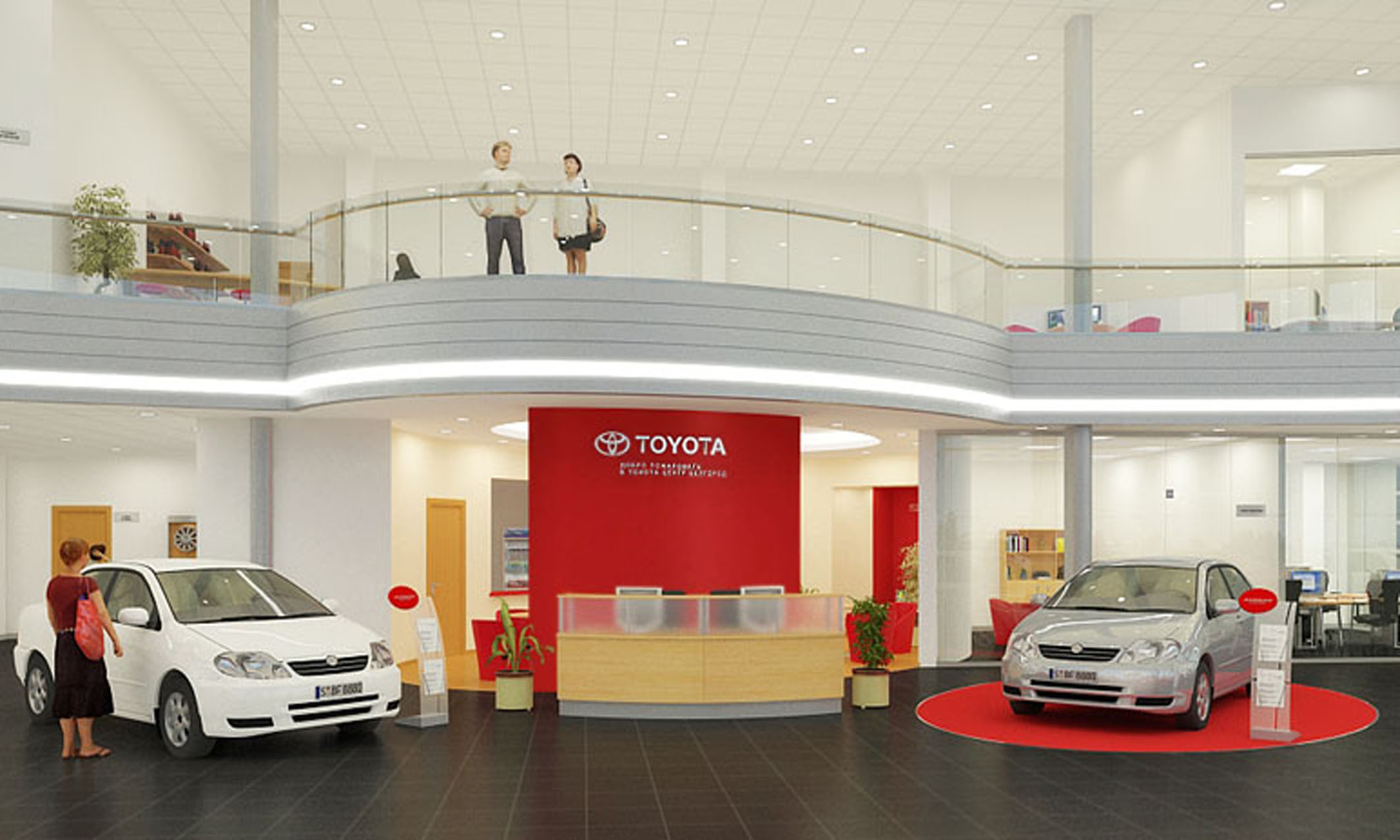 Пример брендирования входа и зоны ресепшн в автосалонах: